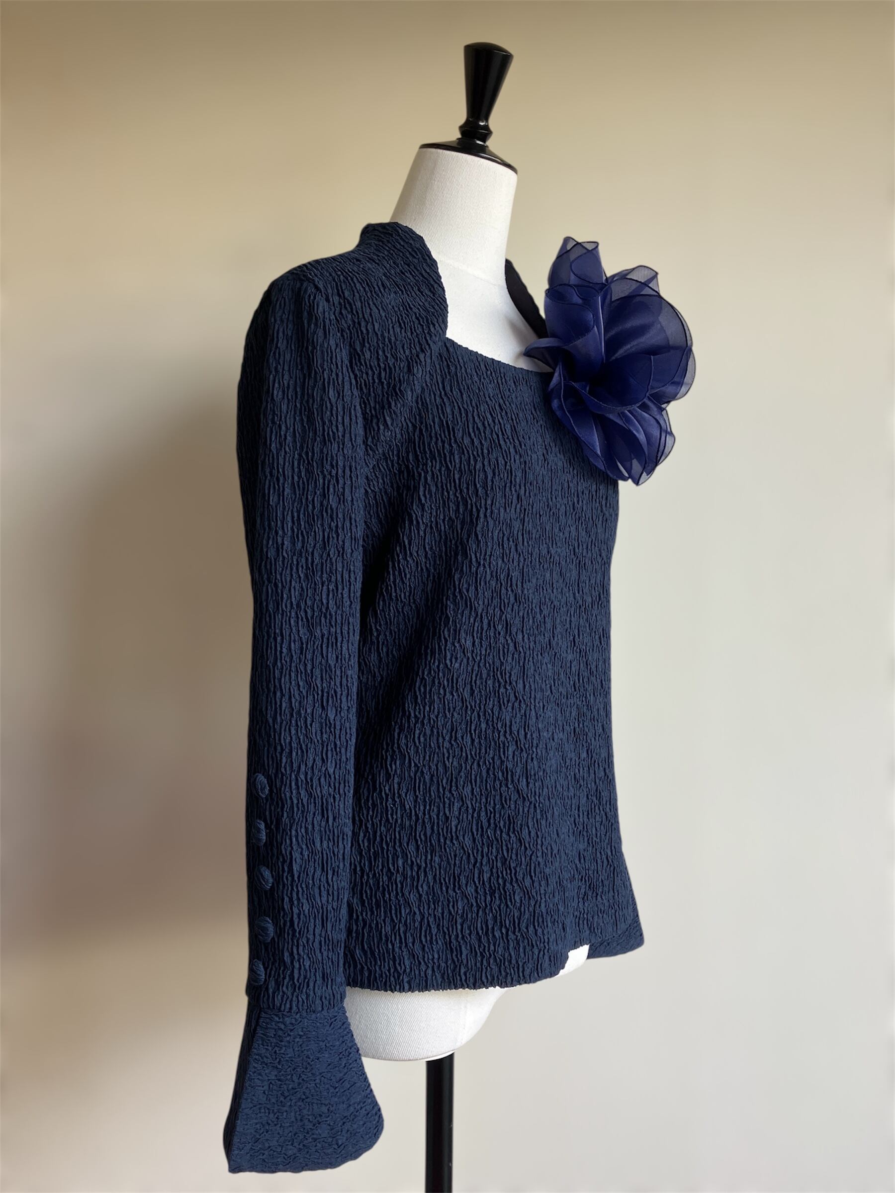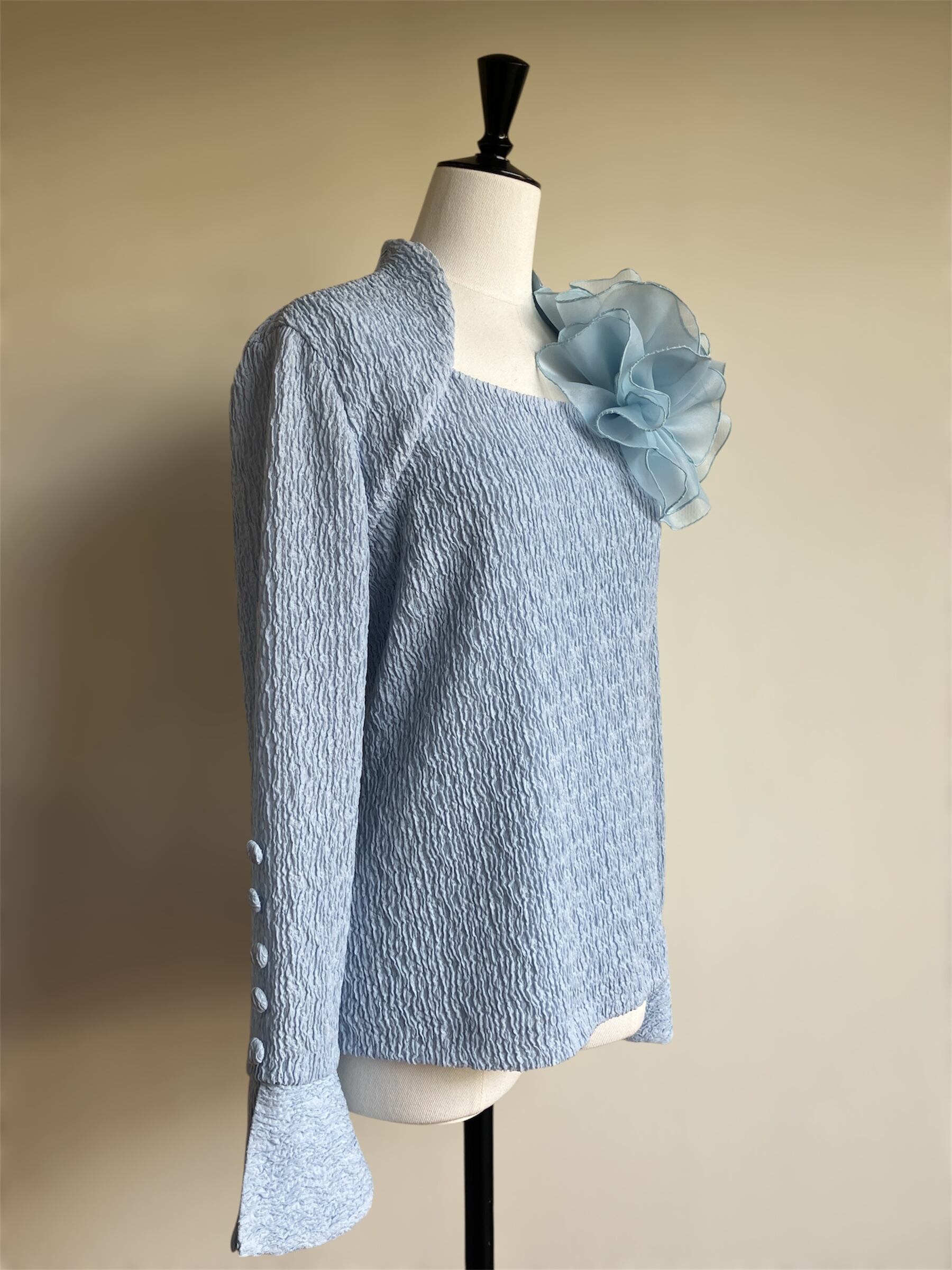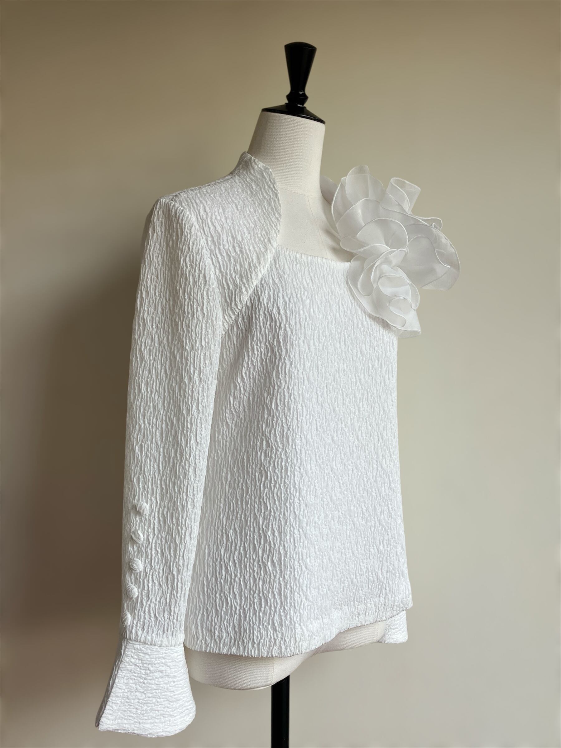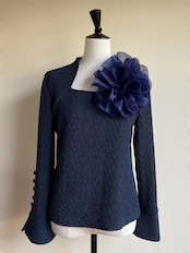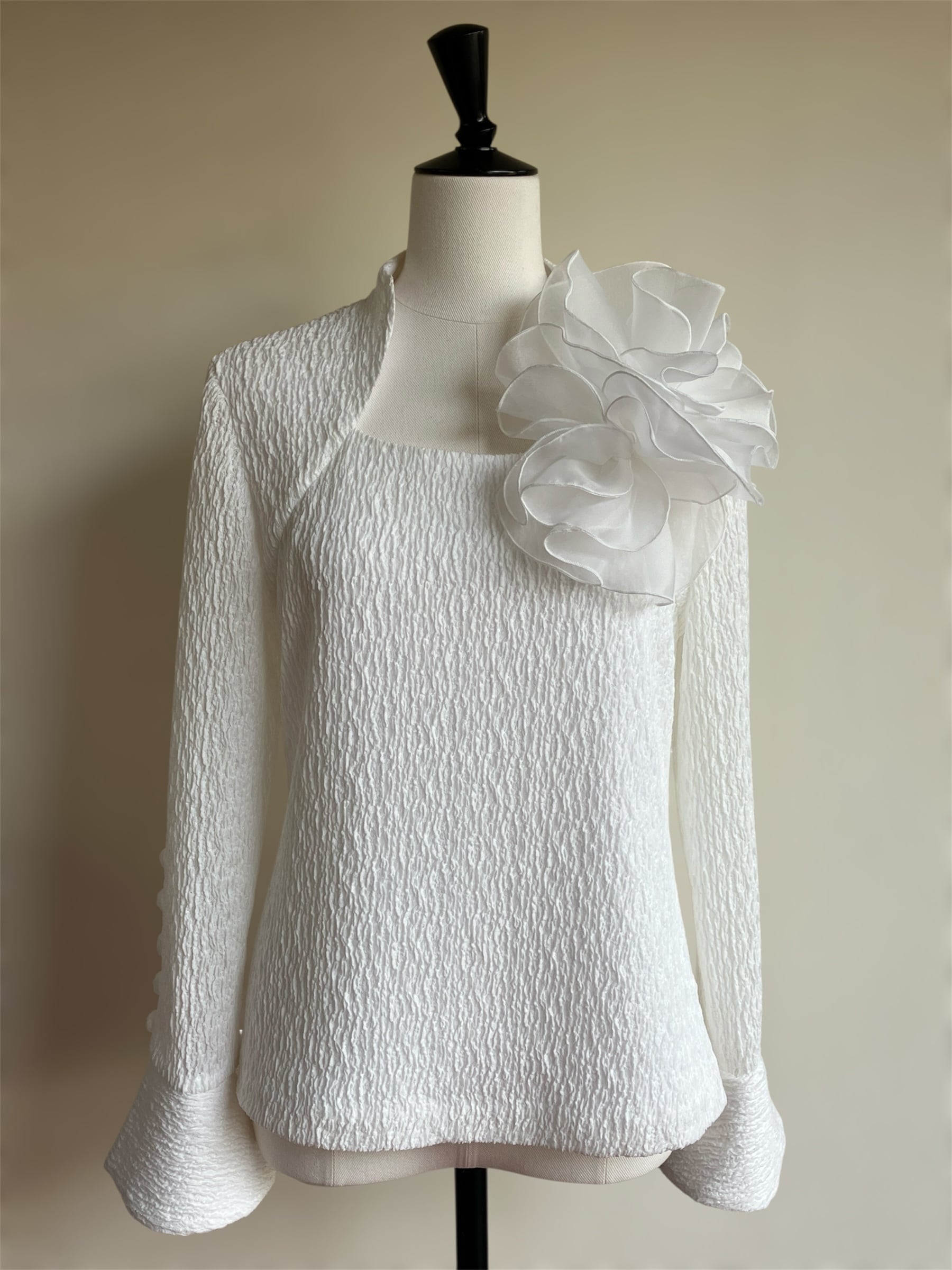 ストレッチ素材を使用したこのブラウスは、快適な着心地と洗練されたシンプルさを兼ね備えています。取り外し可能なモチーフがアクセントとなり、あなたのスタイルに変化をもたらします!カジュアルからお出かけまで、さまざまなシーンで活躍する一枚です。