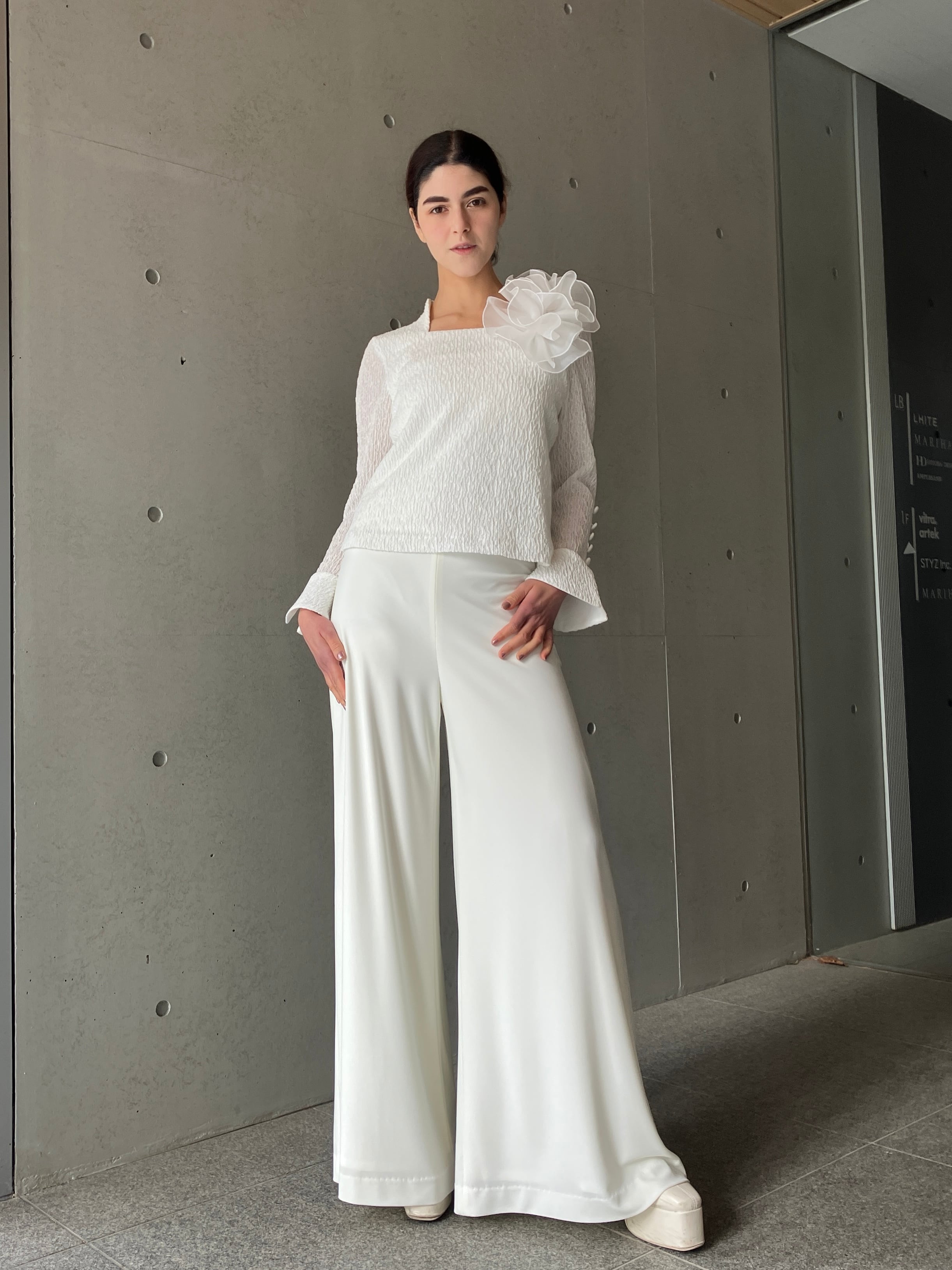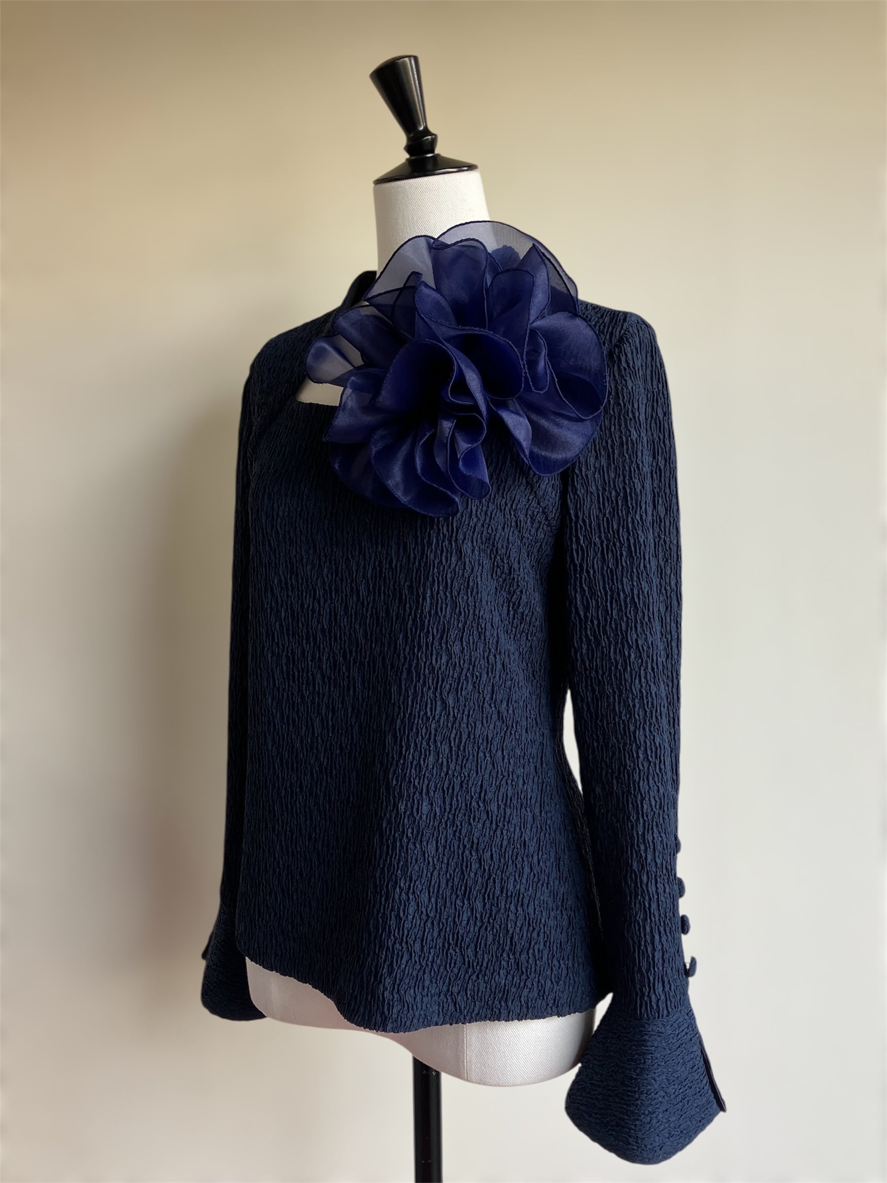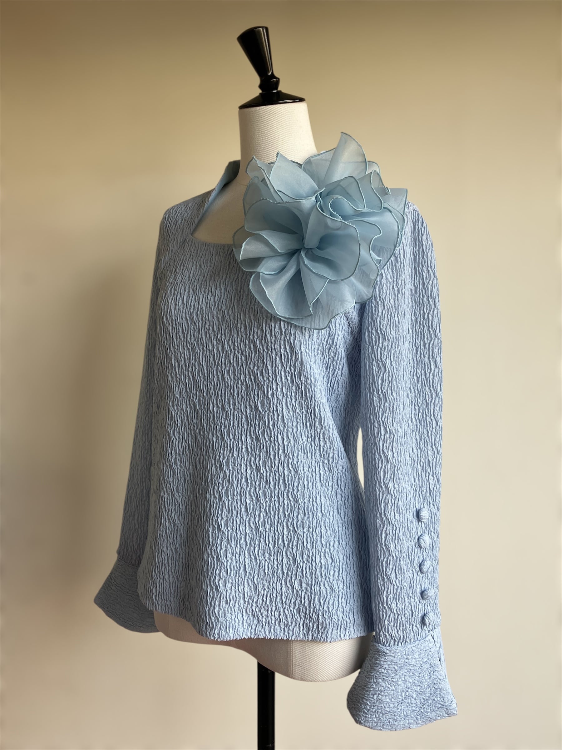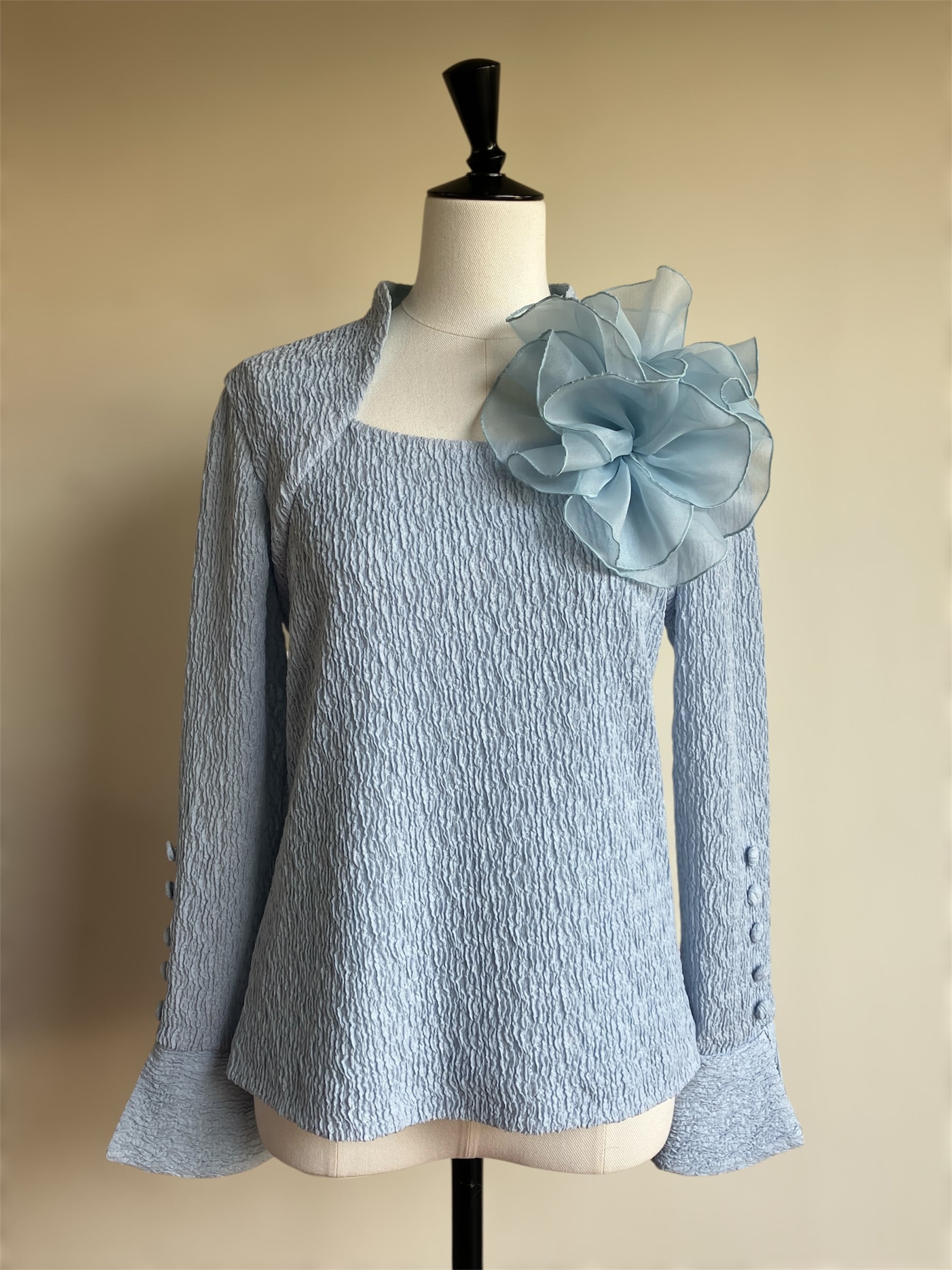 ストレッチ素材を使用したこのブラウスは、快適な着心地と洗練されたシンプルさを兼ね備えています。取り外し可能なモチーフがアクセントとなり、あなたのスタイルに変化をもたらします!カジュアルからお出かけまで、さまざまなシーンで活躍する一枚です。