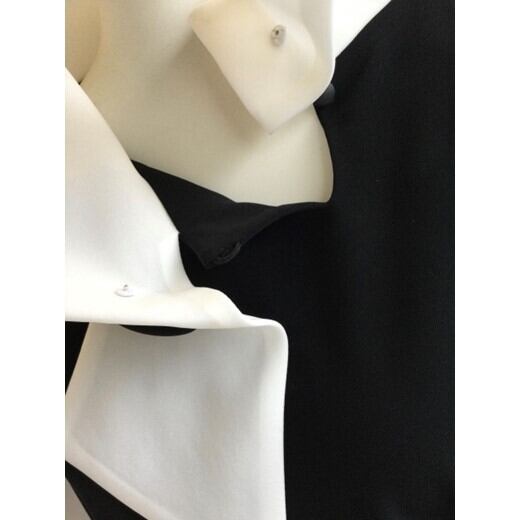 オーガンジーのスタンドカラーにくるみボタンがアクセントになっています。